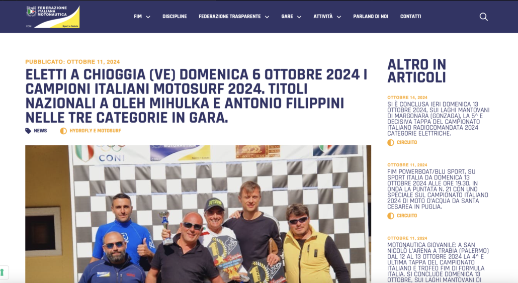 Si è concluso domenica 6 ottobre 2024 a Chioggia (Venezia) il “Grand Prix Aquabike Chioggia Boat Show”, valido come 2ª e ultima tappa stagionale del Campionato Italiano di Motosurf 2024. Tra i grandi protagonisti dell’evento, spicca Antonio Filippini, che si è imposto nelle categorie Amatori e Veterans, portando a casa due titoli italiani.